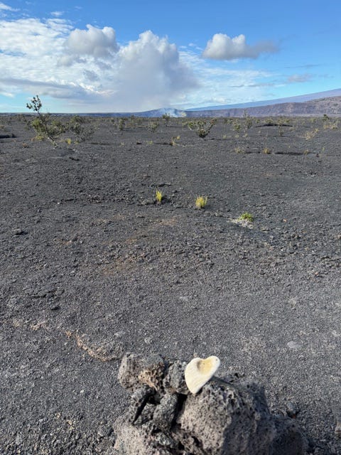 In the morning, we found our way back down to the crater — now eye level with the eruption — we made our offering of gratitude to God and Pele as we witnessed and felt the Goddess of Creation spilling over with love. We thanked her presence and the deep love that generated from the land we enjoy so much. The ocean had gifted me a heart-shaped piece of coral with a small divot in the middle. I left it as an offering to Pele, placing it gently on a lava pile facing the eruption while offering deep thanks.